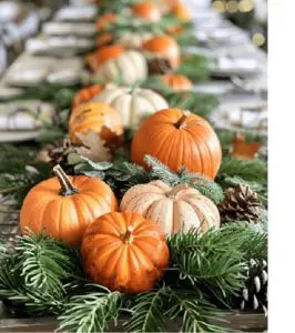 Place a mix of mini pumpkins, pinecones, gourds, and acorns down the center. Scatter eucalyptus, ivy, or sprigs of rosemary for a natural touch that smells as good as it looks. Weave greenery into the runner or tuck a sprig next to each place setting for that fresh, organic vibe.